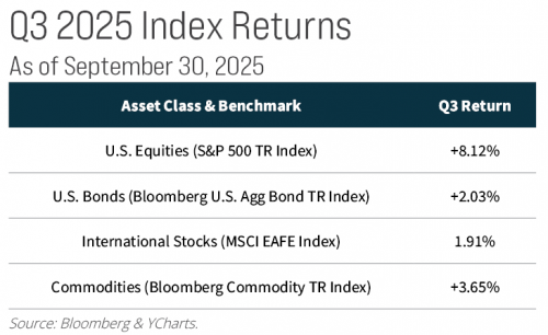 Fixed income markets posted solid results this past quarter, driven largely by monetary policy shifts and strong investor demand. The Bloomberg U.S. Aggregate Index and the High Yield Index both saw returns of more than 2% for the quarter. The Federal Reserve’s 25 basis point rate cut in September anchored short-term yields, while long-term yields rose modestly on deficit and supply concerns, steepening the curve.